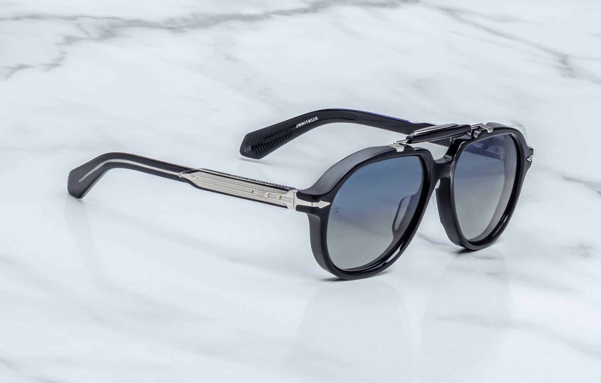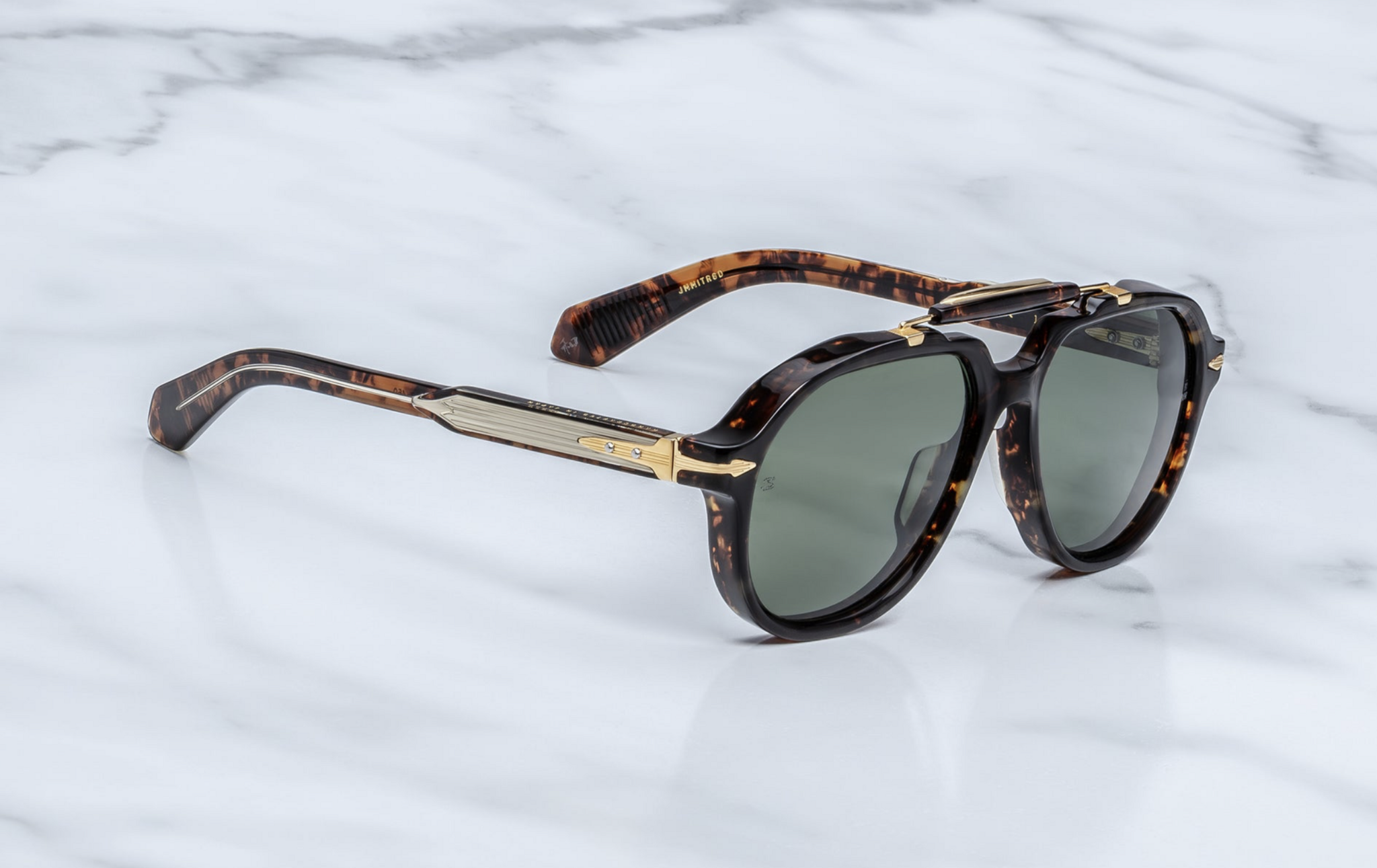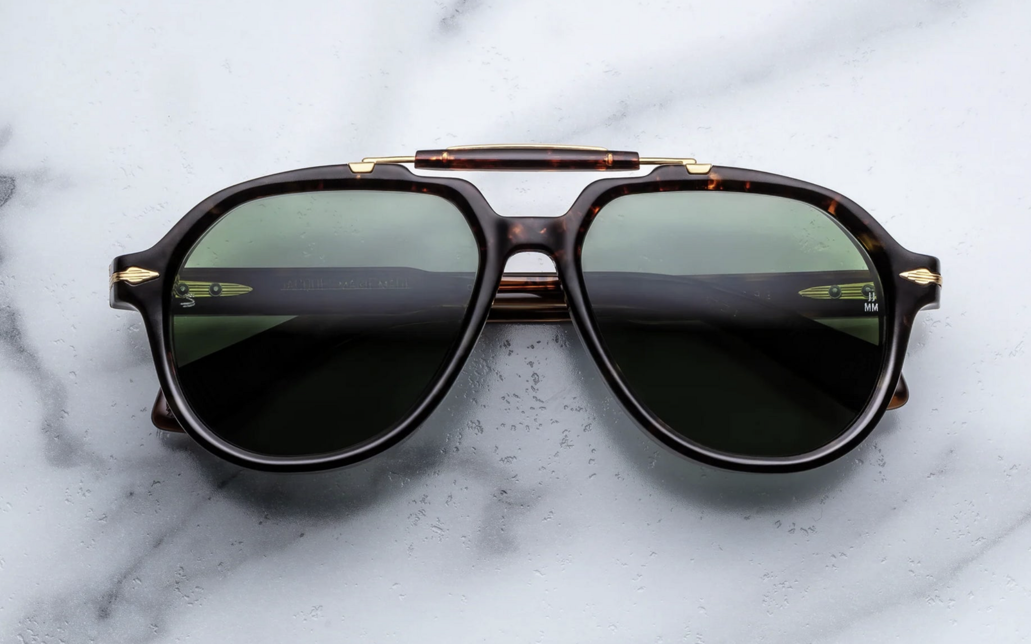 A charismatic ‘90s-inspired aviator handcrafted from cured cellulose acetate, featuring precious metal arrowhead end-piece embellishments, custom 5-barrel hinges, and JMM's signature temple wirecores with refined hairline details.