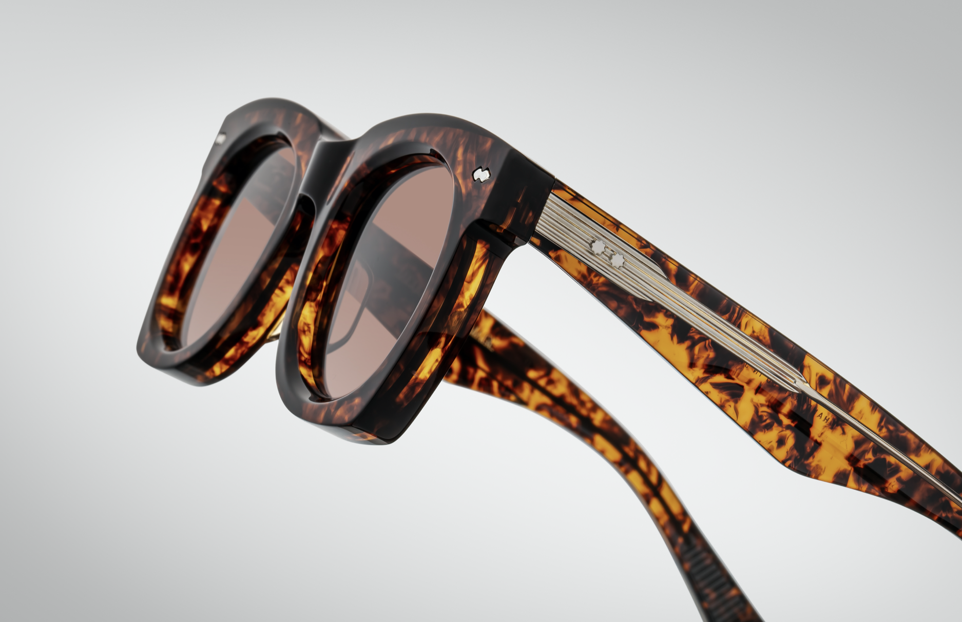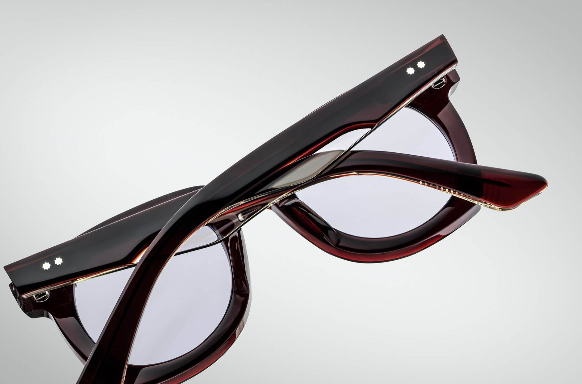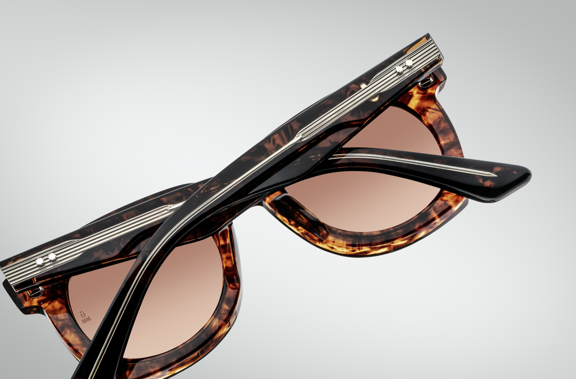 - 8MM CURED CELLULOSE ACETATE FRAME WITH CUSTOM DOUBLE LAMINATED ACETATE TEMPLES FEATURING PRECIOUS METAL HARDWARE AND TINTED LENSES