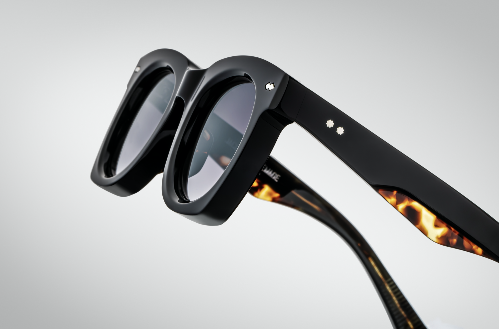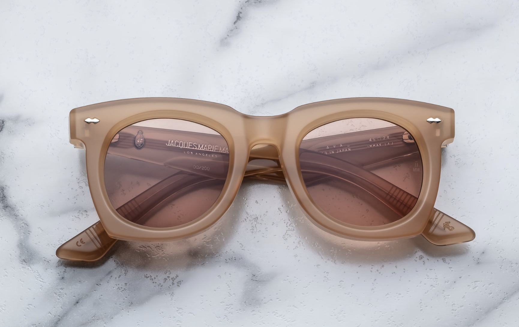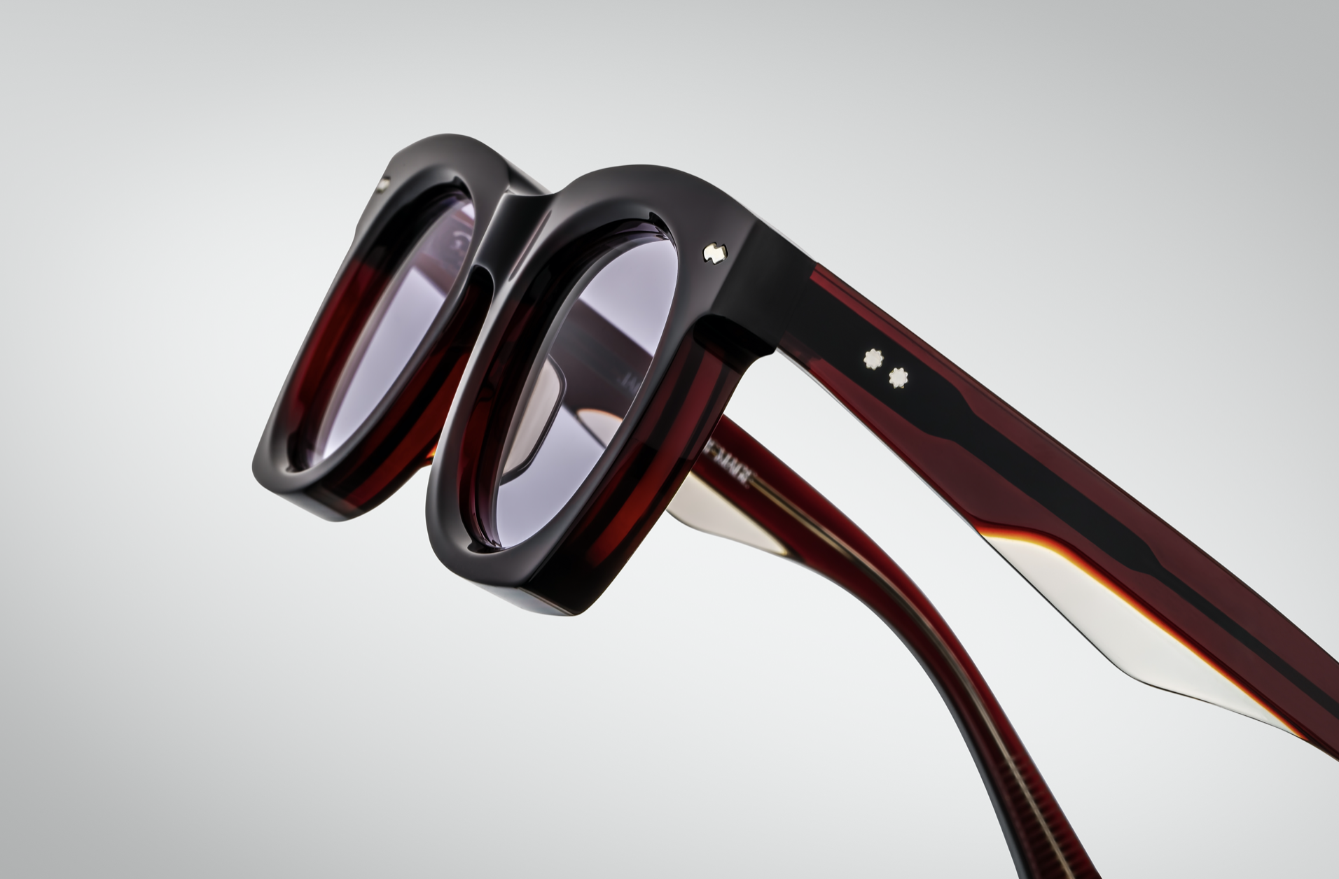 - 8MM CURED CELLULOSE ACETATE FRAME WITH CUSTOM DOUBLE LAMINATED ACETATE TEMPLES FEATURING PRECIOUS METAL HARDWARE AND TINTED LENSES