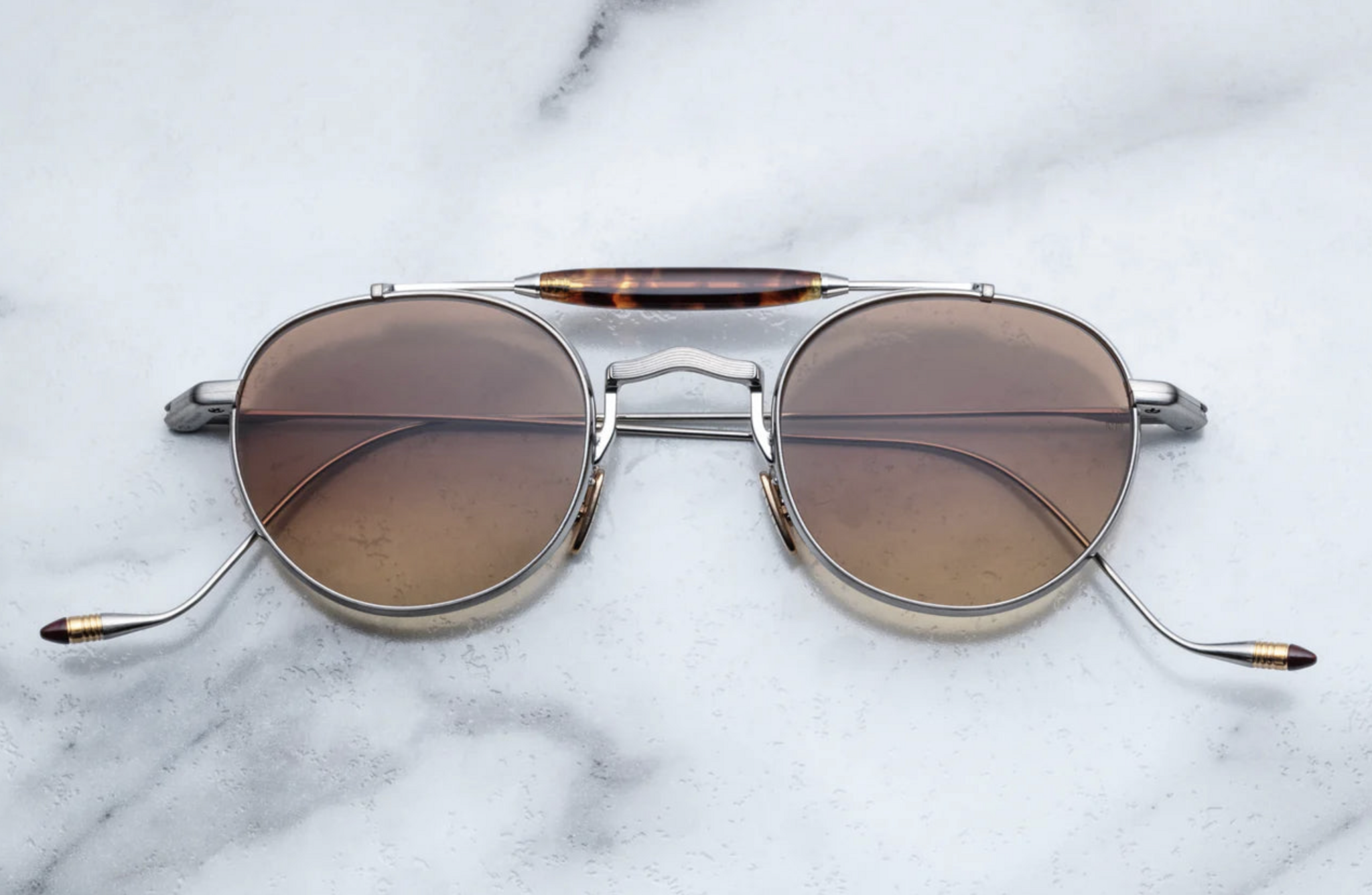 Small and lightweight aviator handcrafted from titanium, featuring attractive double-bridge with distinct acetate brow bar, and our signature, hand-painted epoxy temple tips.
