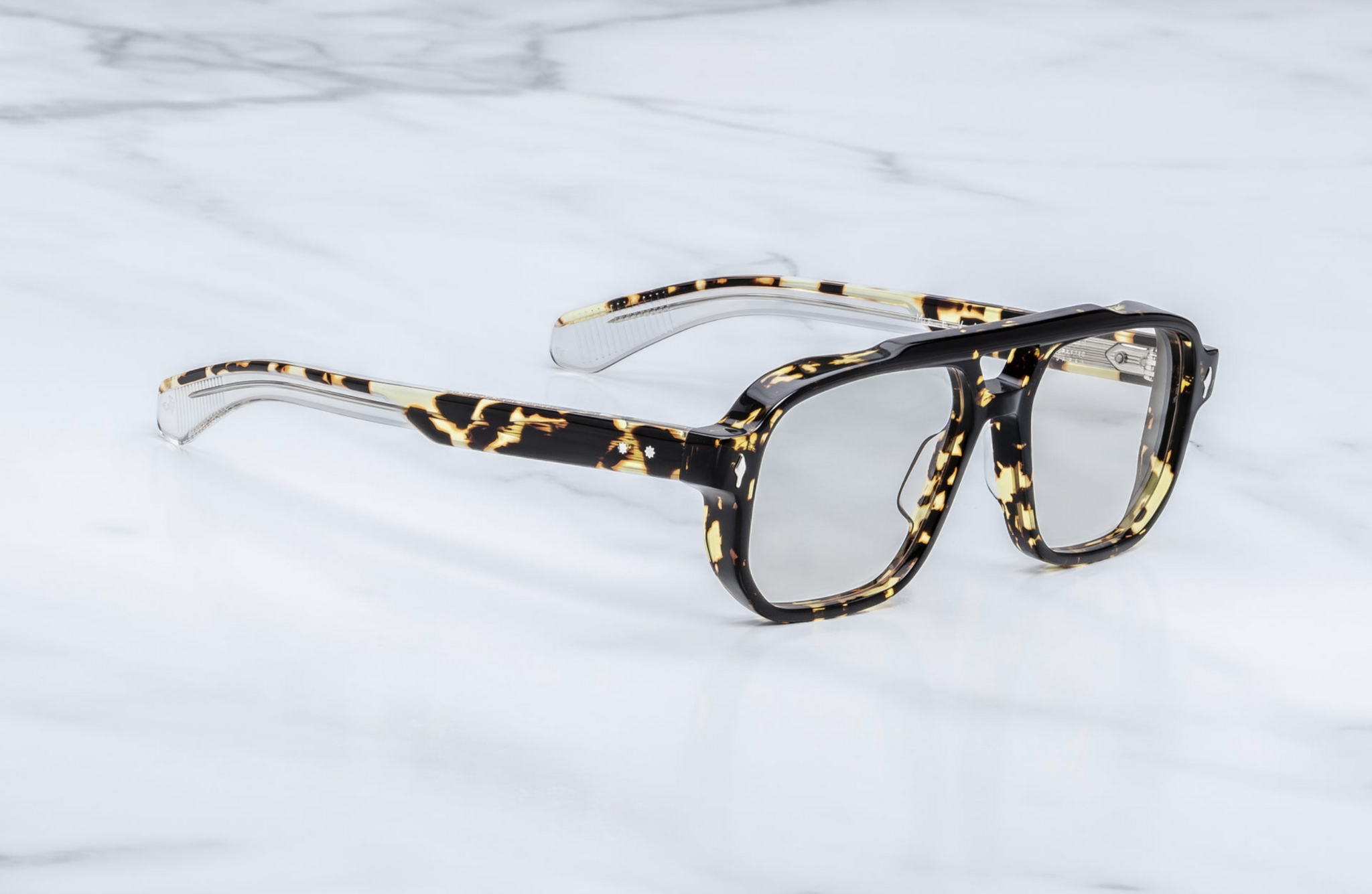 - 10MM CURED CELLULOSE ACETATE FRAME WITH CUSTOM DOUBLE-LAMINATED ACETATE TEMPLES FEATURING PRECIOUS METAL HARDWARE