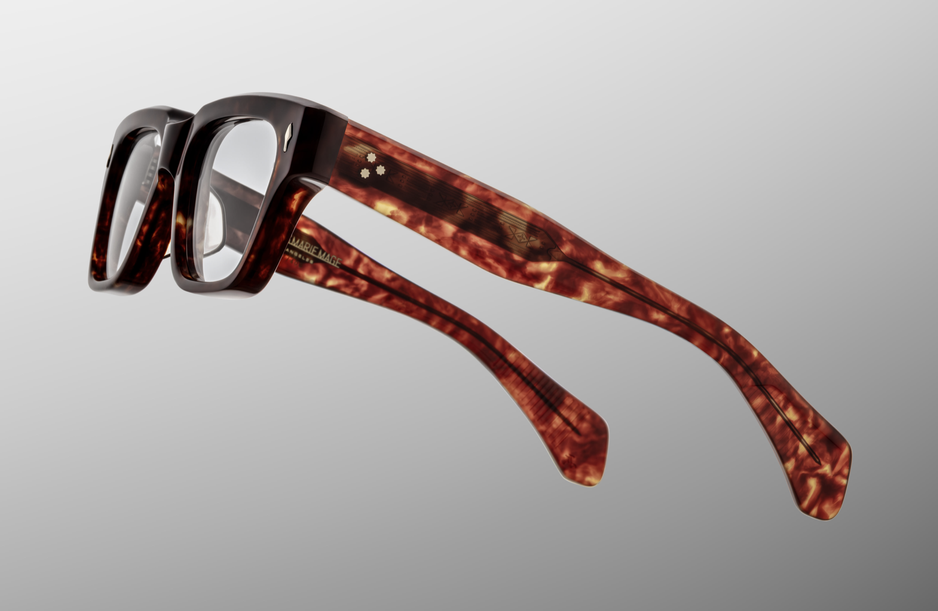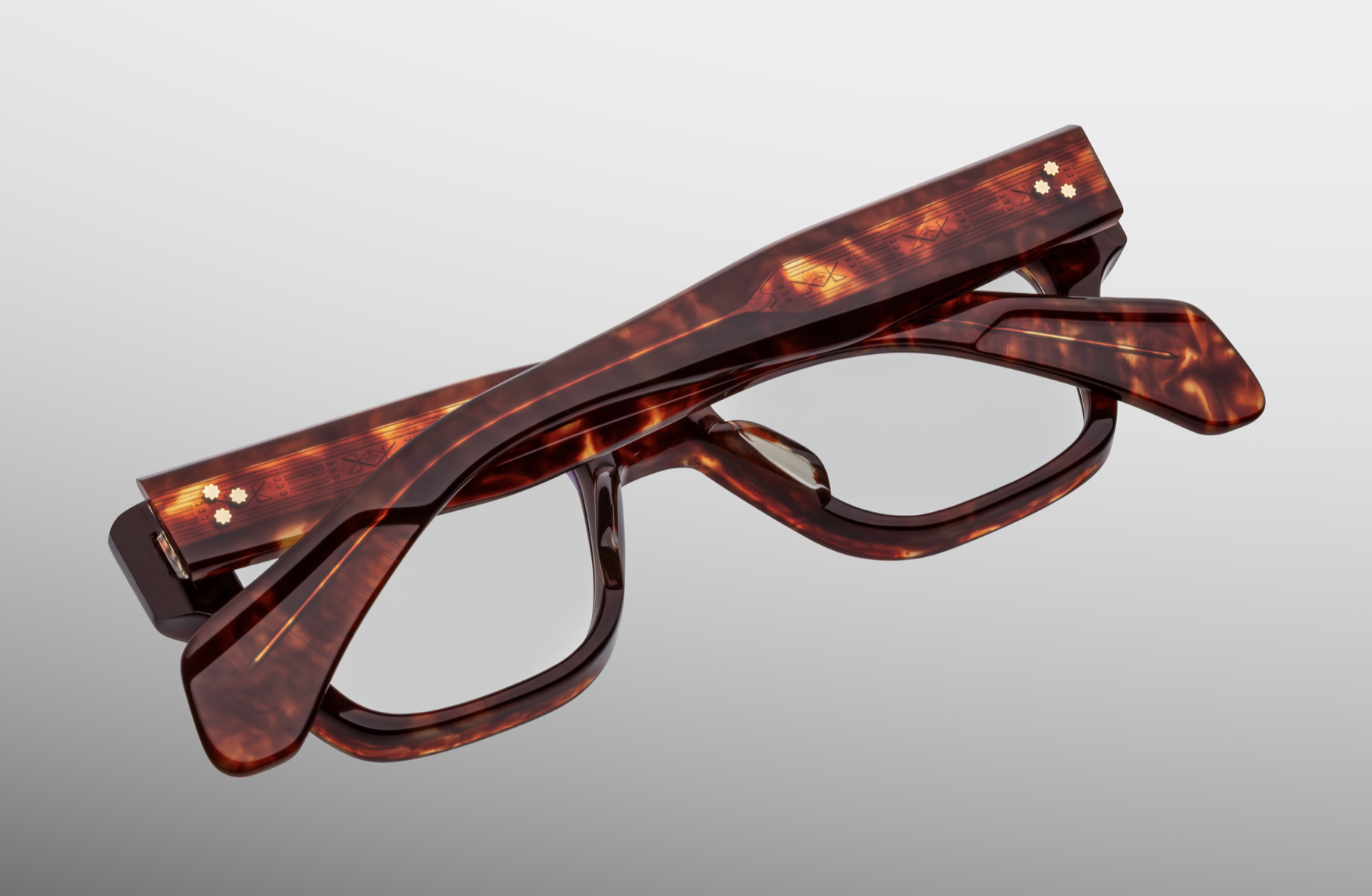 - 10mm cured cellulose acetate frame with custom double laminated acetate temples and demo lenses