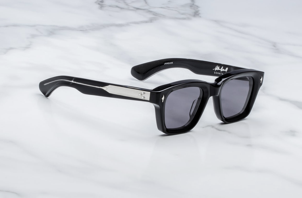 Classic ’60s-inspired spectacles from the Glenn Gould by JMM collection, featuring deeply beveled lens rims complemented by our signature precious metal arrowhead front-pins, spur-shaped rivets, and temple wirecores with refined hairline details.